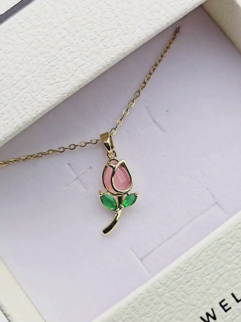 Mia Tulip Necklace features a delicate blush-pink tulip charm with fresh green leaves for a sweet, minimal touch. Perfect for everyday wear. Wear it solo or layer it with your favourites.